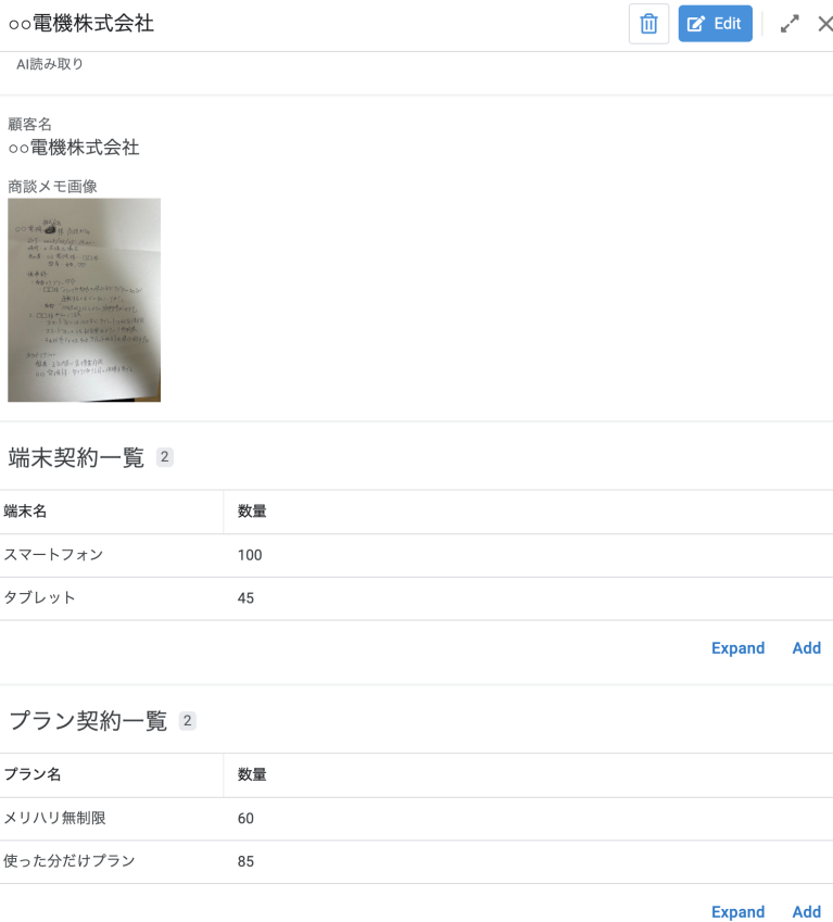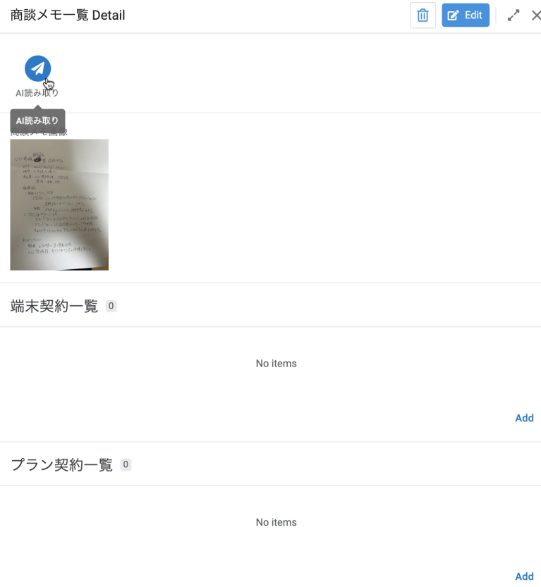 今回AppSheetで作成したアプリケーションのに商談メモの画像(上の画像)を入力して、「AI読み取り」ボタンを押します。