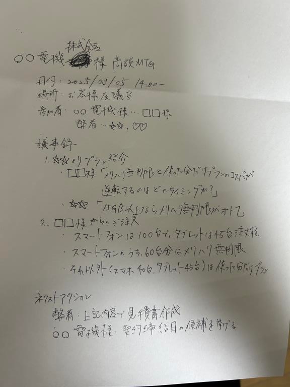 今回は、以下の商談メモの画像をそれぞれ入力し、自動で整理される様子を見ていきます。