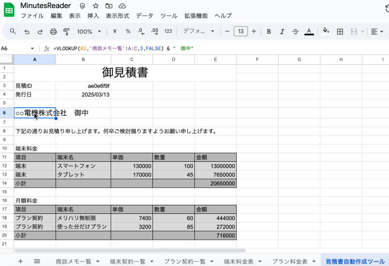 スプレッドシートに格納されたデータを使用して、見積書を自動作成するツール