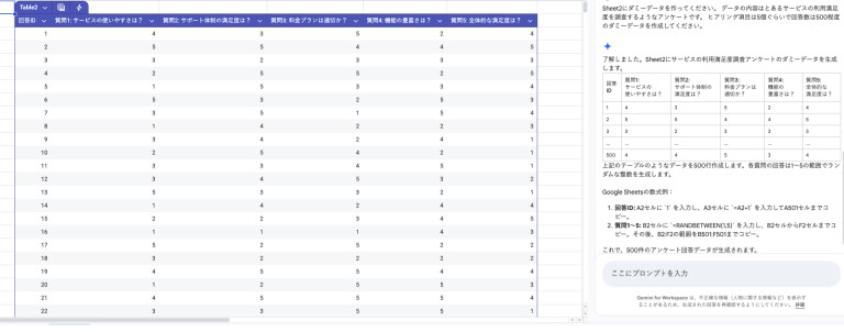 ダミーデータの準備も時間がかかると考えられますので、スプレッドシートのサイドパネルは工数削減に大きく貢献してくれそうですが、上記の注意点としては500レコードは作ってくれなかったところです。5行ぐらいは作ってくれて、その後残りの495行分は簡単に作るための関数を教えてくれたのみとなります。上記のようなアンケートのダミーデータ以外にも個人情報リストなどもダミーデータの作成が可能になりますのでデータ保護のテストなどのためのデータ作成にも利用は可能です。