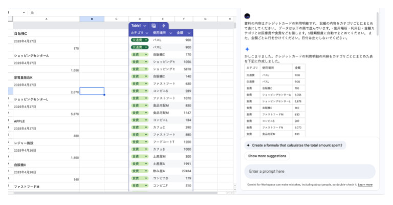 整理されていないデータも、規則が決まっていればGeminiが整理と分類をしてくれるので、とても楽になると考えられます。