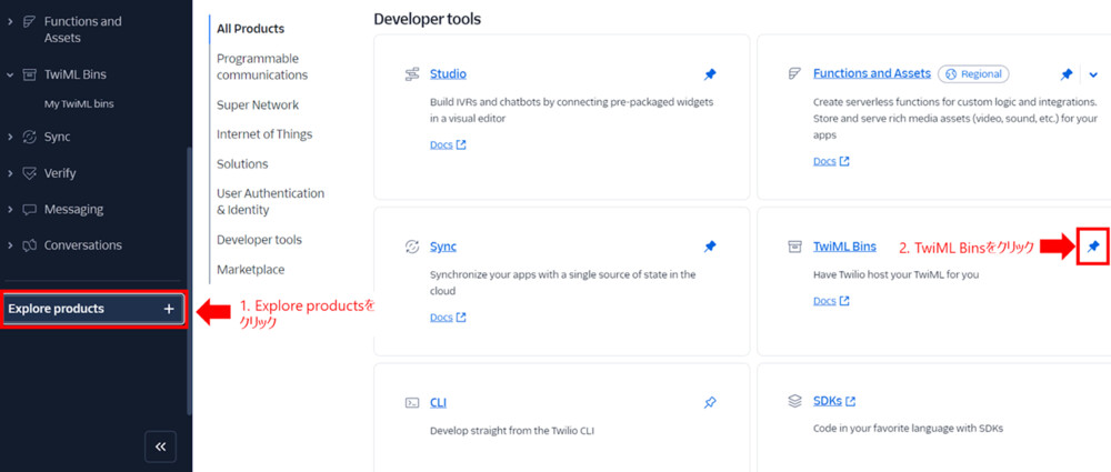 2.TwiML Binsをアカウントダッシュボードに固定します。