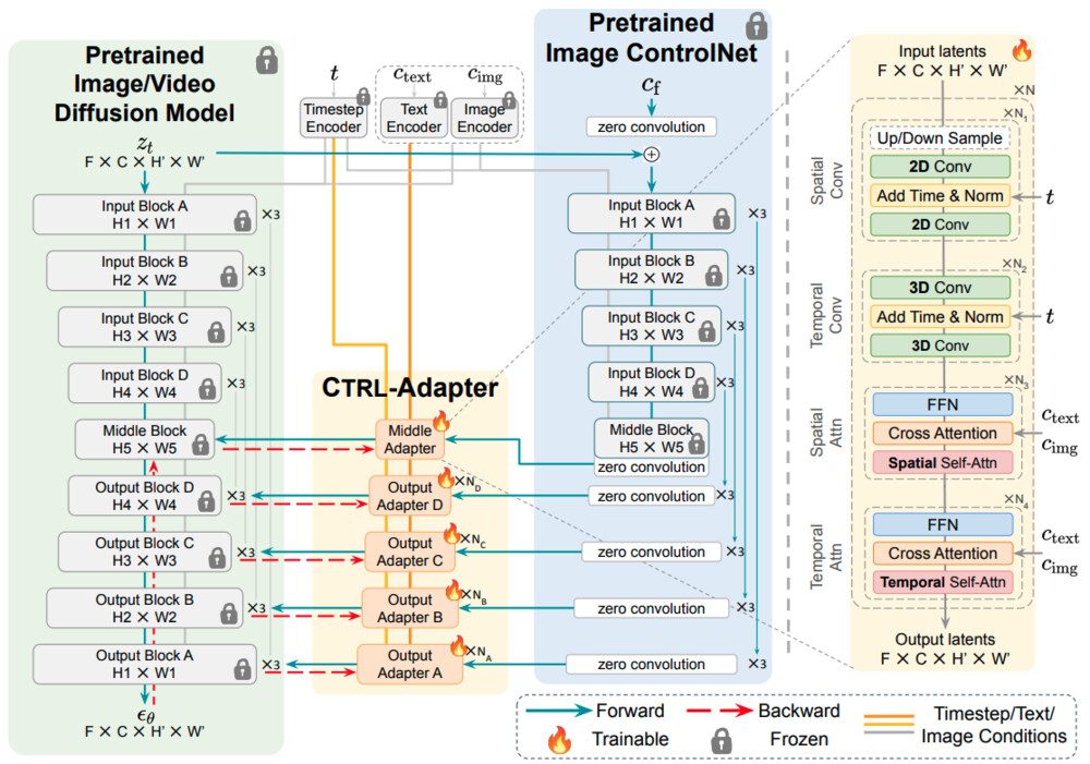 事前学習済みのControlNetの中間/出力ブロックを、ターゲットとなる事前学習済み動画拡散モデルの対応する中間/出力ブロックへマッピングするアダプターモジュールを訓練し、事前学習済みのControlNetとバックボーン拡散モデルのパラメータは固定されたまま、効率的な適応を可能にします。バックボーンが同じ数の出力ブロックを持たない場合、ControlNetの特徴を、潜在表現の高さと幅が最も近い出力ブロックにマッピングします。
