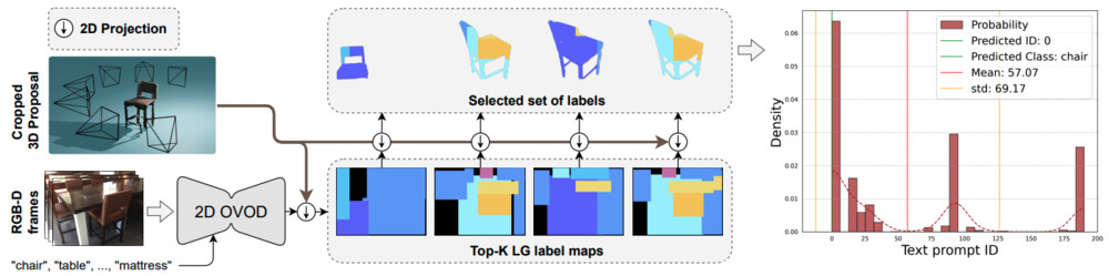 次に、各3D物体候補に対して可視性が高い上位k個の視点からクラス情報を取得し、ラベルマップを割り当てます。最後に、k個の視点から集約されたクラス情報を分布化し、分布の中で最も尤もらしいクラス情報がその3D物体候補に割り当てられます。