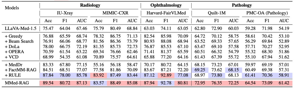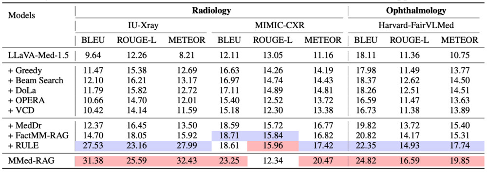 実験では、放射線学、眼科学、病理学など5つの医療データセットを用いたVQA(医療質疑応答)と、画像とクエリを元にレポートを生成するタスクで評価を行いました。ほとんどの項目で既存手法を上回り、さらに質疑応答タスクでは18.5%、レポート生成タスクでは69.1%の精度向上が確認され、提案手法の有効性を示しました。