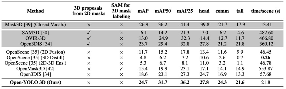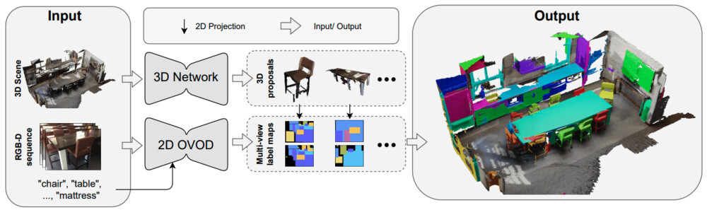 提案手法では、3Dの物体候補検出モデルと2D OVOD(オープンボキャブラリー物体検出)モデルを統合し、大規模基盤モデルを使わず、またそれらの特徴量を3D空間に拡張せず推論を高速化することで、任意のカテゴリに対応可能かつ高効率な3Dインスタンスセグメンテーションを実現しました。