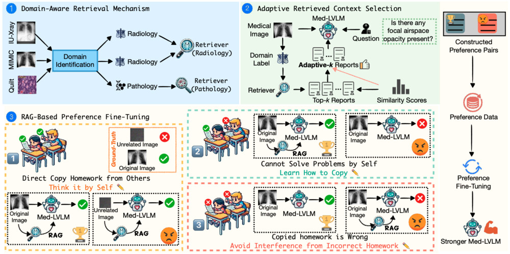 医療画像のドメイン(放射線画像、病理画像など)を自動的に識別し、適切な外部知識を検索することで、異なる医療分野に対応可能な汎用性を実現します。