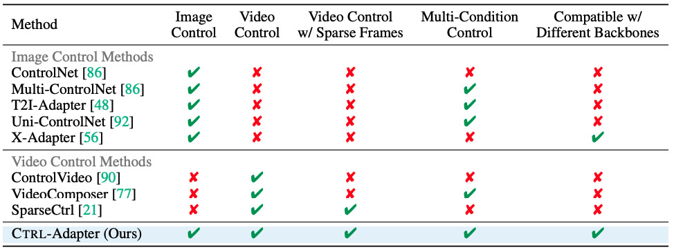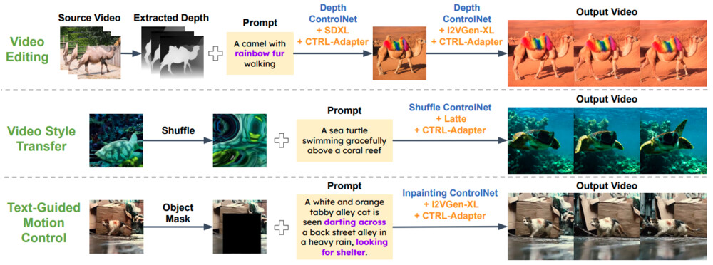 この研究は、ControlNetとバックボーンモデルの間にモジュールを追加することにより、事前学習済みのControlNetを再学習することなく、任意の画像・動画の拡散モデルに条件付き生成を可能にし、多様な制御機能を効率的かつ汎用的に実現するフレームワークCTRL-Adapterを提案しています。