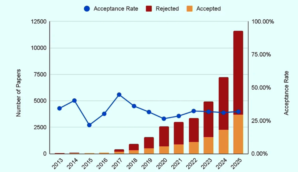 ICLR 2025に投稿された論文数は11,672本、採択数は3,704本で、採択率は31.73%です。投稿数は昨年に比べて60.73%増(昨年:7,262本)、採択率は横ばい(昨年:31.12%)です。