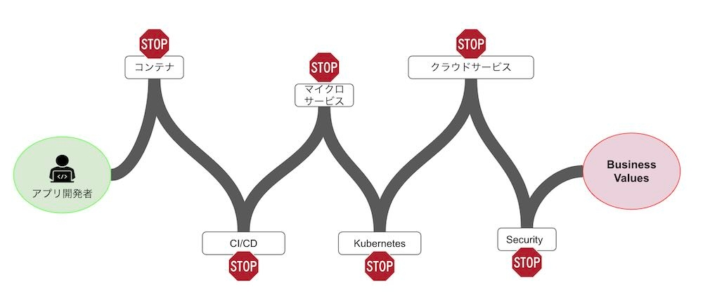 開発に集中したいのに「Kubernetesとはなにか」「CI/CDでの継続的な検証やデプロイをする」「Containerを使って開発環境の標準化」などの「認知負荷」が発生し、キャッチアップする工数が必要になります。