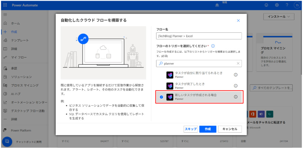 3-2 フローのトリガー選択にて Planner の「新しいタスクが作成される場合」を選択し作成に進む