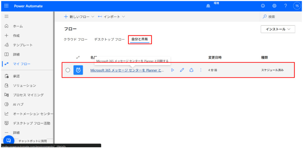 管理センターで作成したフローは Power Automate > マイフロー > 自分と共有 で確認できます。
