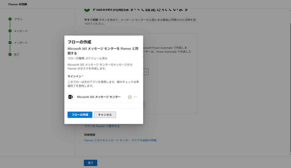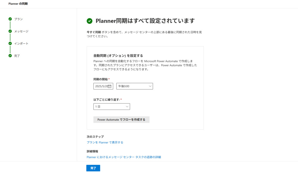 ここまでの設定の確認と完了の後に続く画面で自動同期設定を行います。トリガーとなる日時を設定し[Power Automate でフローを作成する] > [フローの作成]をクリックするだけで完了です。