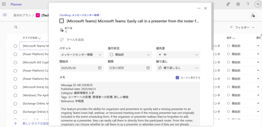 メッセージセンターから毎日1回 Planner に情報を同期する → Planner に新しく追加されたタスクから必要な情報を抽出し、必要に応じて英語から日本語に翻訳した内容を Excel に出力する