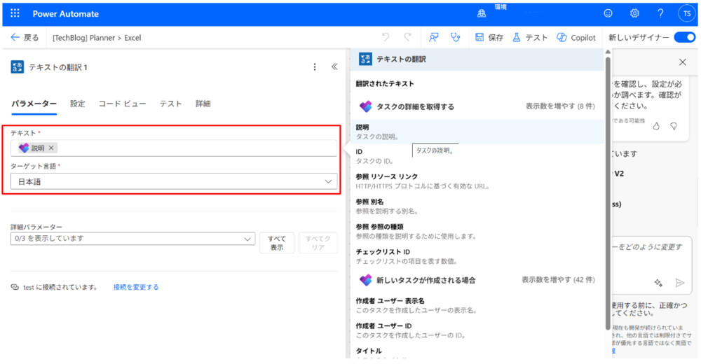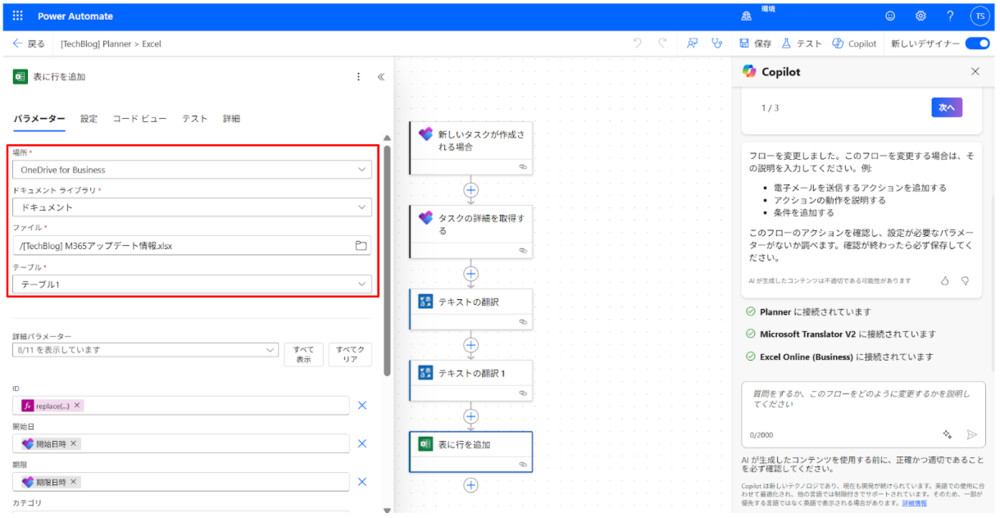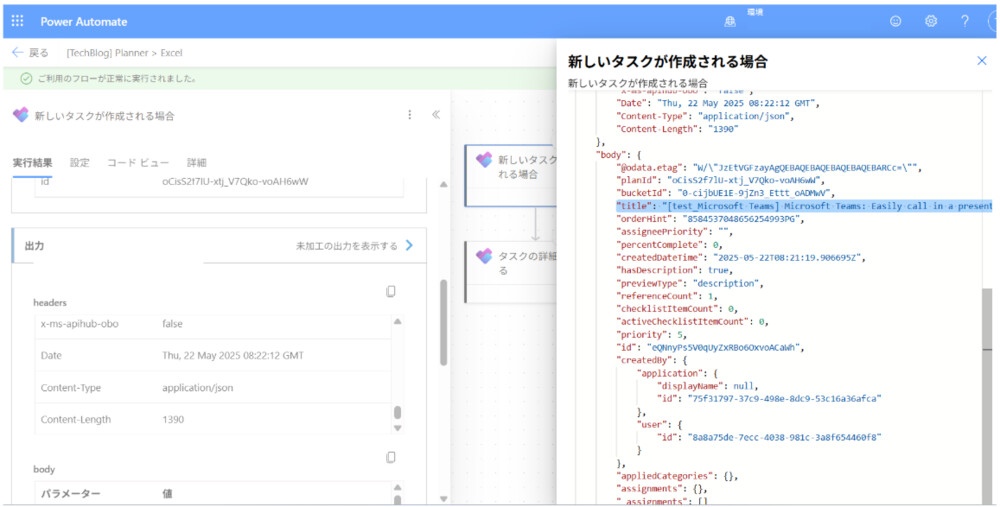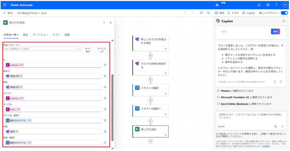 Planner に追加されたタスクから必要な情報を抽出・翻訳し、Excel に追加するフローができました。