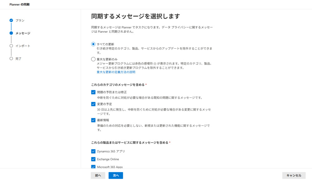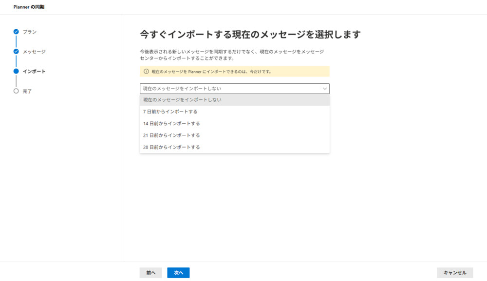 2-1 管理センター > 正常性 > メッセージセンターにアクセスし、[Planner の同期] > [同期の設定] をクリック