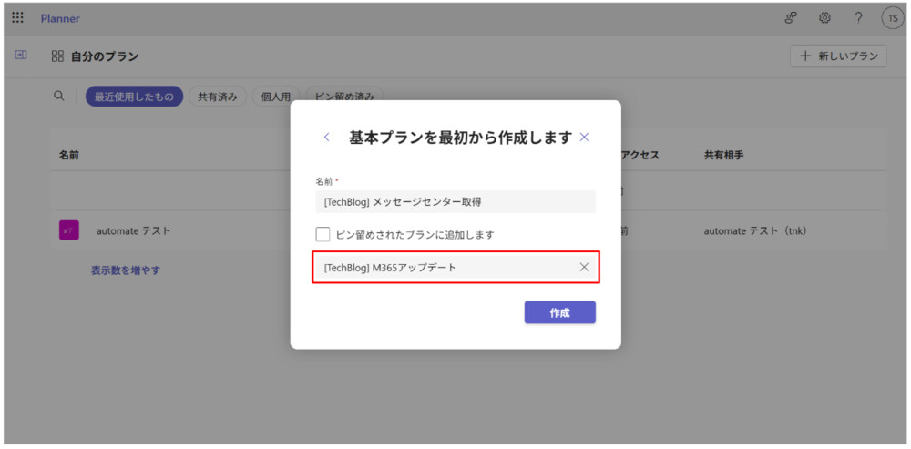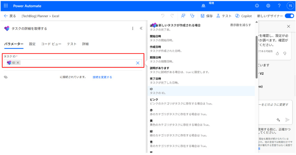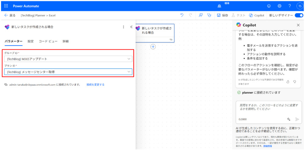 3-3 「新しいタスクが作成される場合」のパラメーター設定にて事前準備で作成したPlanner を選択