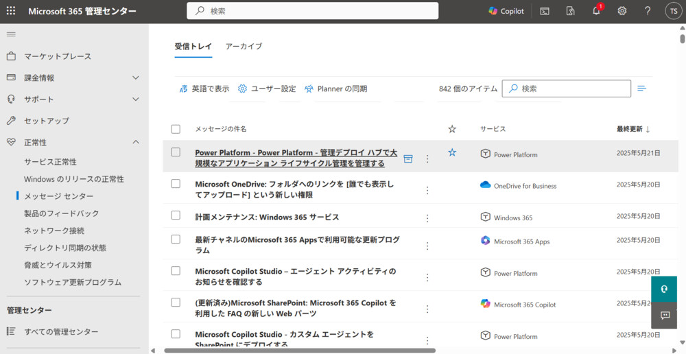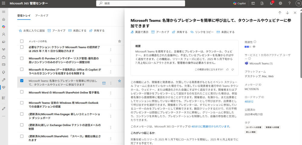 冒頭で述べたように、Microsoft 365 に関する新機能や変更点は Microsoft 365 管理センター内のメッセージセンターに通知されています。