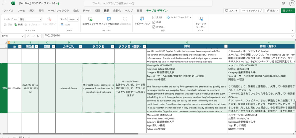 メッセージセンターにて日本語で表示されている場合でも、Planner に同期される情報はすべて英語になるため、タスクのタイトルや詳細な情報については英語→日本語に翻訳して Excel に出力します。