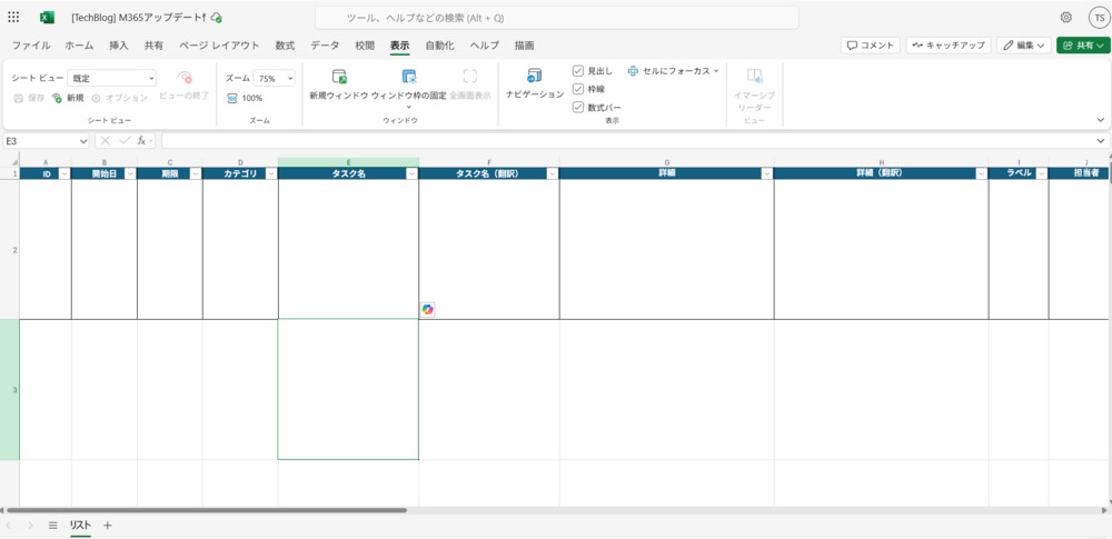 テーブルを作成したExcel を用意します。今回は以下のヘッダーを持つテーブルを作成しました。ヘッダーは必要に応じて適宜変更してください。