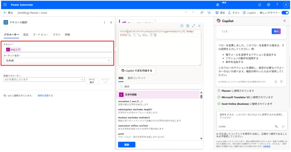 ここまでのフローで取得した情報を次のステップから関数を利用して必要な部分だけを抽出したり、アクションで翻訳したりしていきます。