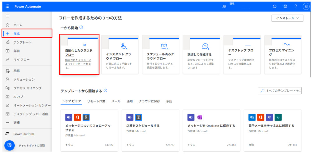3-1 Power Automateにアクセスし、[作成] > [自動化したクラウドフロー] を選択