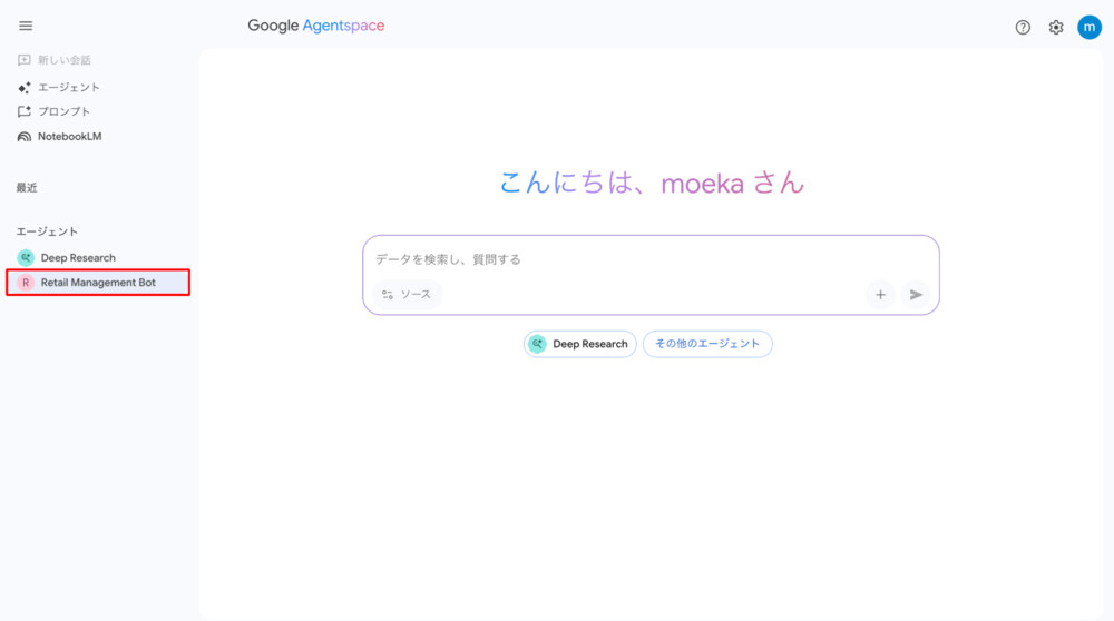 Agentspace の左メニューより、今回作成したエージェントを選択します。(Agentspace トップ画面にて、自動的にエージェントを呼び出すことも可能です。)