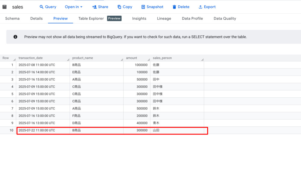 BigQuery の売上データを更新すると、先ほど Agentspace 上で入力したデータが追加できていることが確認できました。