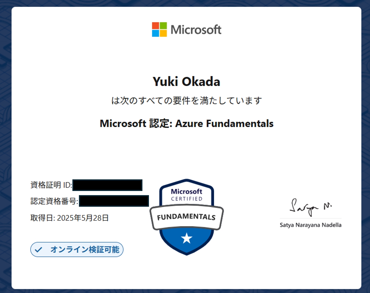 私は2025年5月に「Microsoft Certified: Azure Fundamentals(AZ-900)」の資格試験に合格しました。