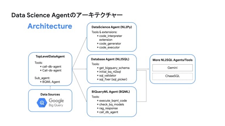 データベース・エージェントがリアルタイムの売上データを集計・分析し、BQMLエージェントが将来の数値を予測します。
