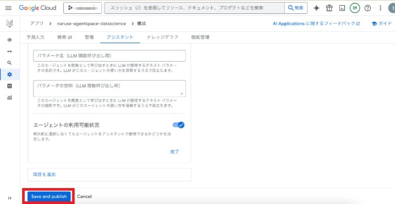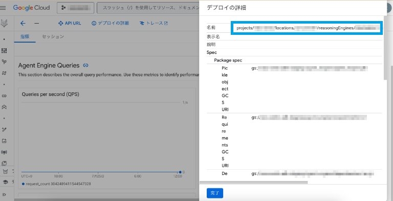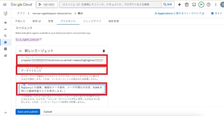 9. 「新しいエージェント」の「エージェント」に Agent Engine のデプロイ名 (※1) を入力します。