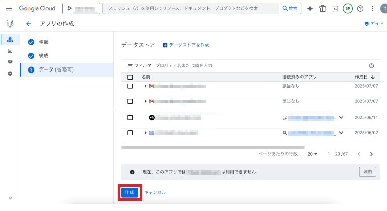 4. データストアの作成はスキップして。「作成」をクリックします。