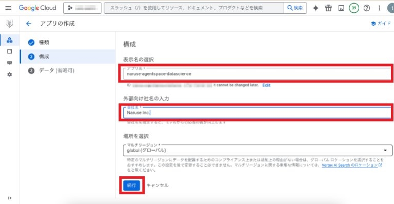 3. 構成で、「アプリ名」、「会社名」をそれぞれ入力して、「続行」をクリックします。