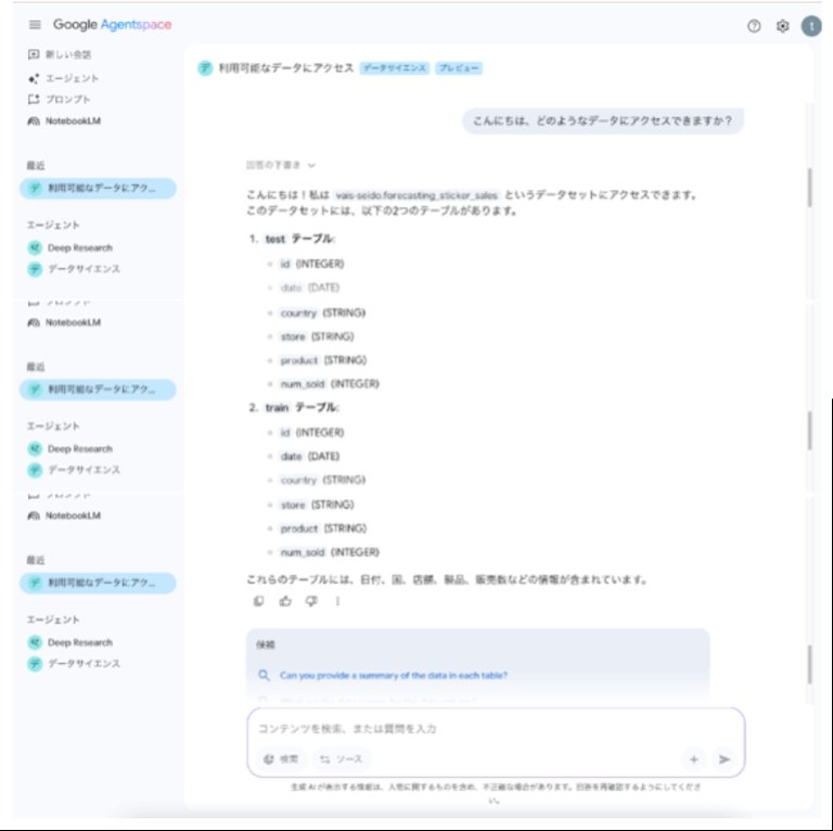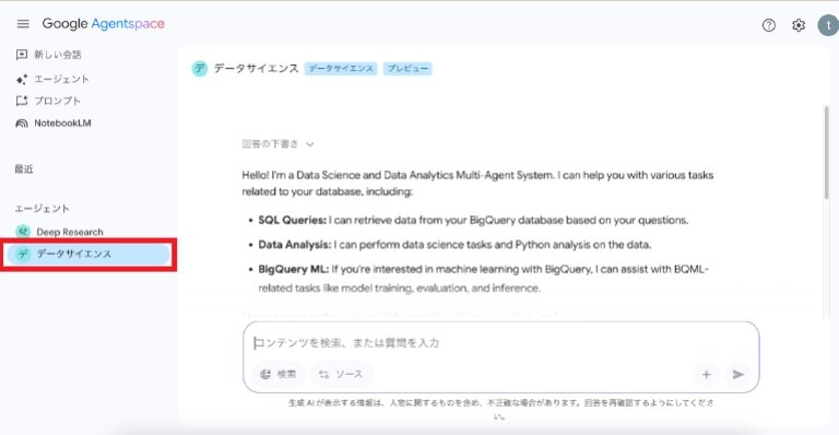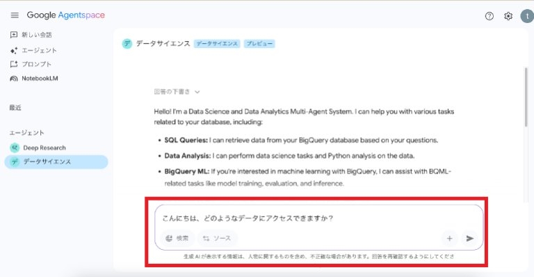 ここからは、既にAgent Engine にデプロイ済みのAIエージェントを Agentspace に登録するところから、自然言語で BigQuery のデータセットを照会・可視化するところまでを試していきます。