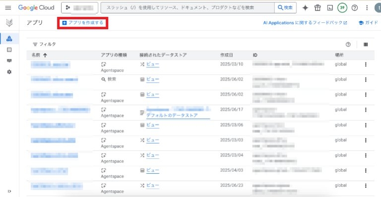 2. 「作成するアプリの種類」で「Agentspace (プレビュー)」内の「作成」をクリックします。