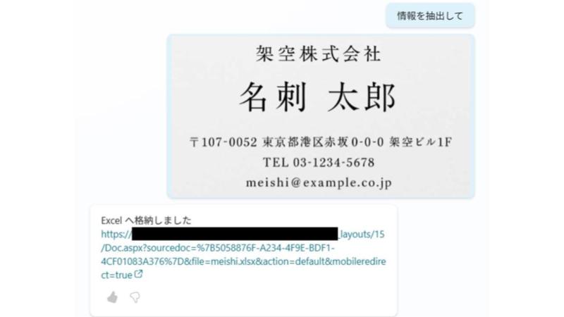 例えば、以下の画像のような名刺の情報を Excel に記載する作業があったとします。(Copilot に作成してもらい、若干漢字の記載がおかしい箇所がありますが…それも含めて情報を抽出してもらえるか検証してみましょう。)