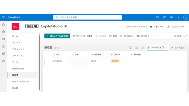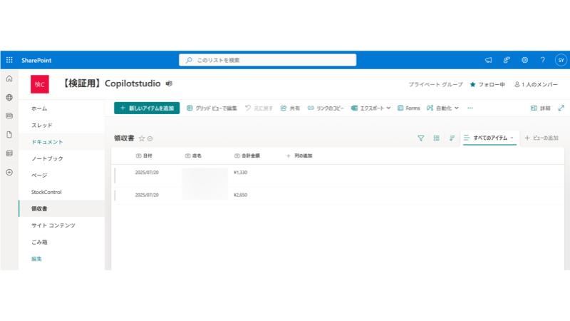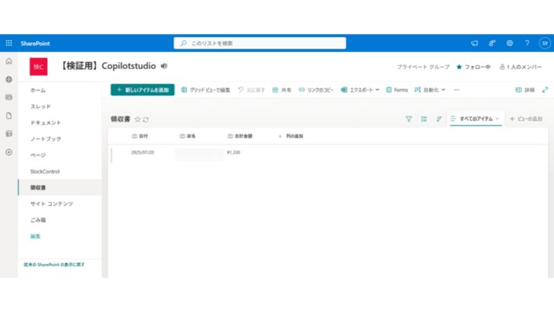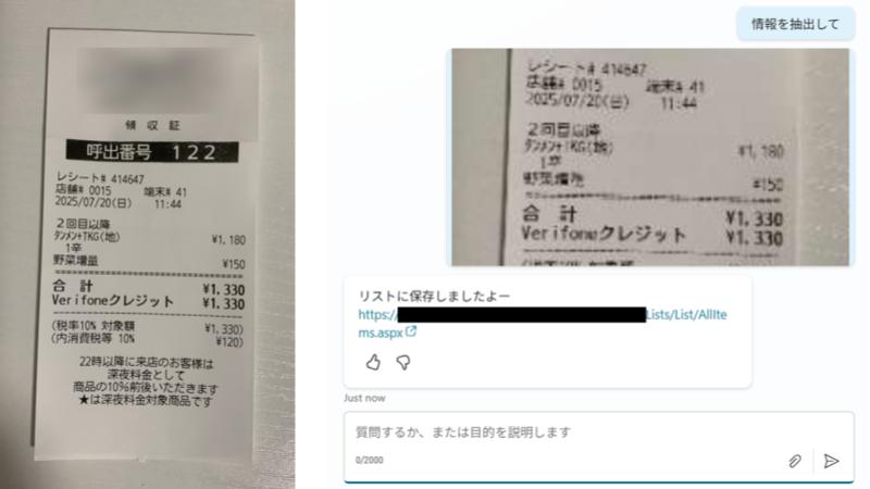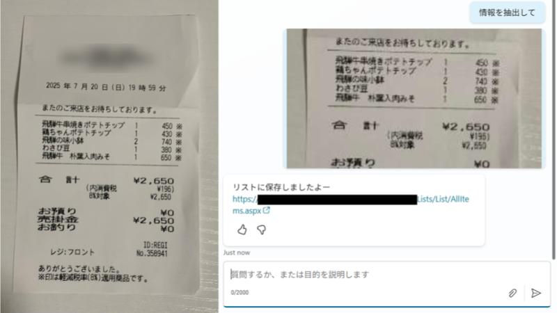領収書の場合でも必要な情報をエージェントが情報を抽出してくれて、指定の SharePoint のリストに保存してくれました。店名も隠してはいますが、しっかりと情報を読み取ってくれました。ちなみにレシートのフォーマットを変えてみても必要な情報は抽出してくれました。