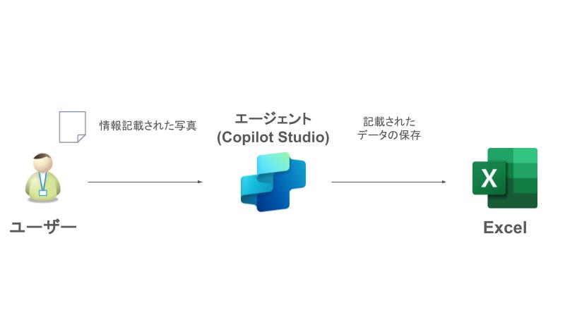 情報の転記作業に時間がかかるということは、ユーザーがパソコンを使って情報を入力する時間を少なくすればいいのではないかと思いました。そこで安直な考えですが、その情報が記載されている媒体をカメラで撮影して写真にし、それを Copilot Studio で作成したエージェントが情報を読み取ってくれて、指定のフォーマットなどに書き起こせればいいのではないか?と考えました。イメージ図としては以下のようなものです。