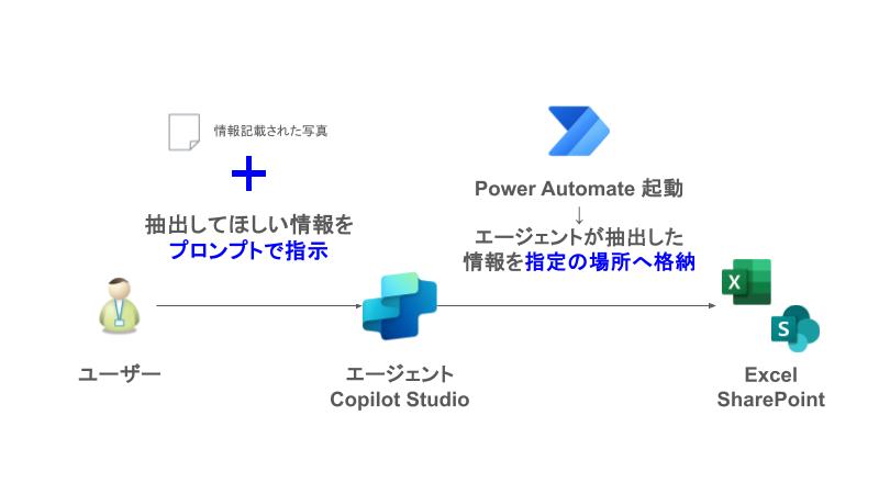 たしかに画像をエージェントが解析してくれるのは本当ですが、エージェントに読み取ってもらう情報の指示出しをあらかじめプロンプトで行っていたり、読み取ったデータを保存する場所は Power Automate と呼ばれるノーコード・ローコードで日々の業務のフローを自動化するツールと Microsoft 365 アプリと連携して指定しています。こちらのツールはローコードで業務フローの自動化構成を作成できます。(以下は今回ご紹介した画像を読み取るフローの概要です)
