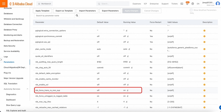 2.エンドポイントを切り替えた後、切り替え元のRDSは強制 Read-Only モードに変更されます。これは、パラメータ rds_force_trans_ro_non_sup が自動的にOFFに切り替わるためです。もし切り替え元RDSで引き続き書き込みを行いたい場合は、このパラメータを手動でONに設定する必要があります。