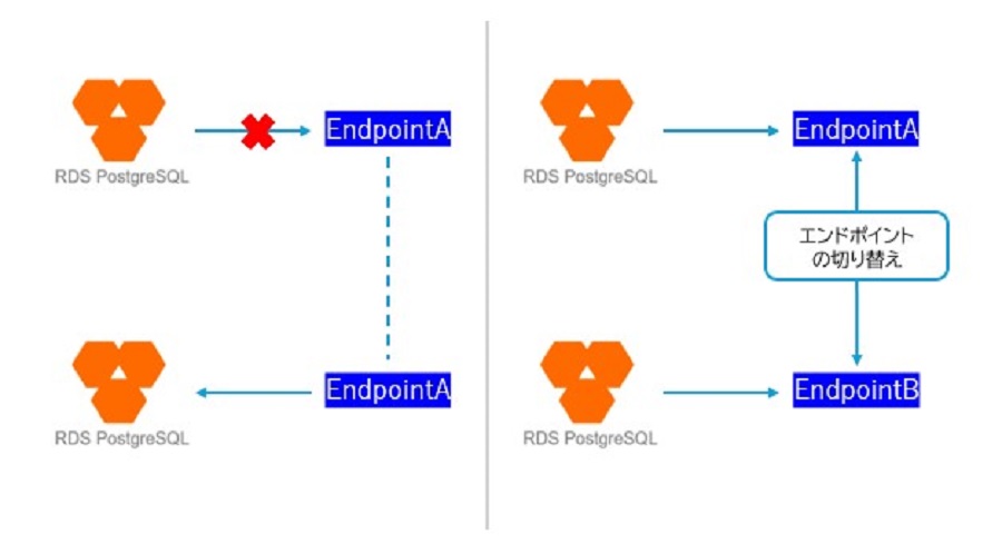 従来のRDSエンドポイント切り替えでは、障害発生時やインスタンス移行時に、接続エンドポイントを移行先へ引き継ぐ対応が必要となり、その過程でサービス停止時間や運用負荷の増加が課題となっていました。旧RDSインスタンスで利用していたイントラネットまたはパブリックエンドポイントを新しいクラスタに引き継ぐには、以下の手順を実施する必要があります。