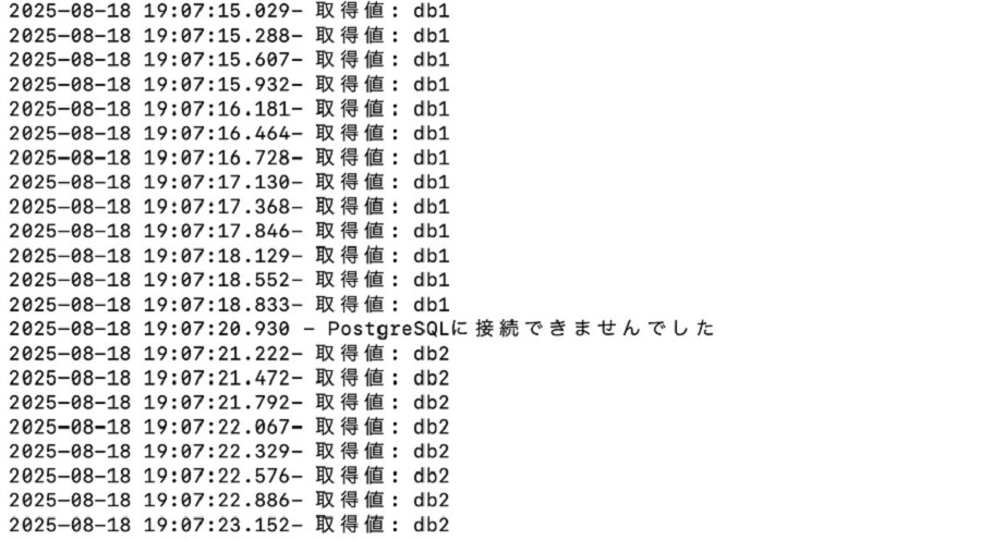#!/bin/bash PGHOST="<切り替え元RDSのエンドポイント>" PGPORT="5432" PGDATABASE="testdb" PGUSER=”<DB管理者のユーザー名>" PGPASSWORD="<DB管理者のパスワード>" export PGPASSWORD while true; do RESULT=$(psql "host=$PGHOST port=$PGPORT user=$PGUSER dbname=$PGDATABASE connect_timeout=1" -t -A -c "SELECT my_column FROM my_table LIMIT 1;" 2>/dev/null) if [ $? -eq 0 ] && [ -n "$RESULT" ]; then echo "$(gdate '+%Y-%m-%d %H:%M:%S.%3N')- 取得値: $RESULT" else echo "$(gdate '+%Y-%m-%d %H:%M:%S.%3N') - PostgreSQLに接続できませんでした" fi done |