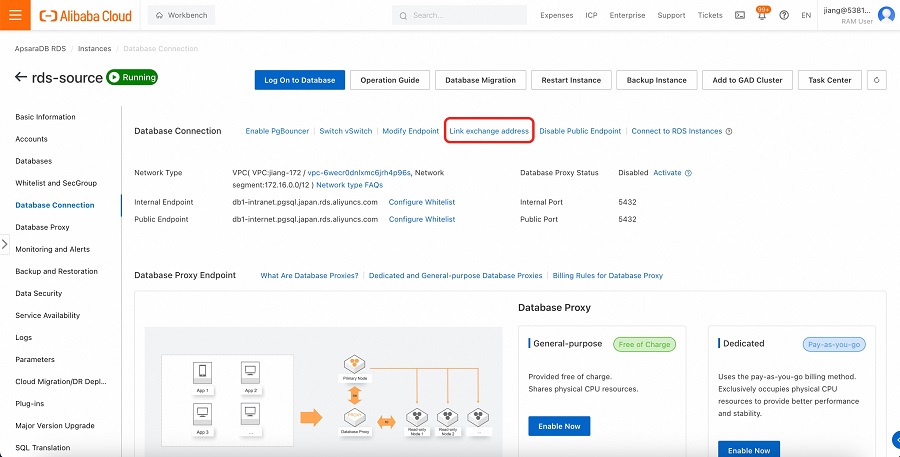 6.切り替え元RDSにて「Database Connection - Link exchange address」をクリックします。