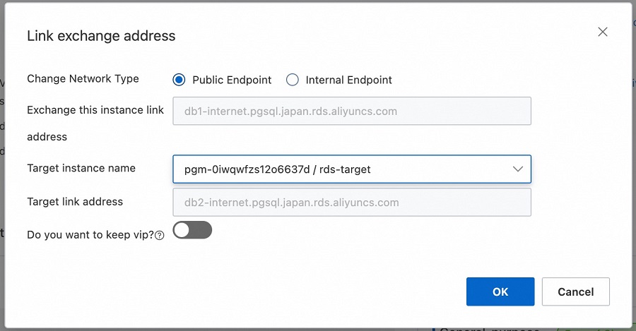 7.今回はパブリックエンドポイントの交換を行います。切り替え先のRDSインスタンスIDを選択すると、交換先のパブリックエンドポイントが自動的に入力され、「OK」をクリックします。