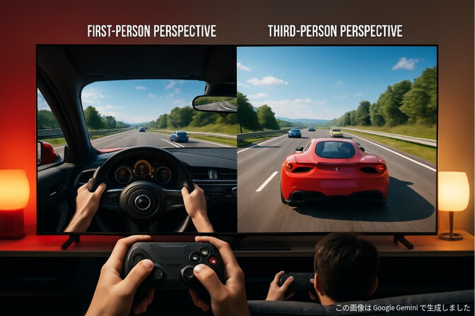 一人称視点をレーシングゲームを例に説明すると、一人称視点映像(画像左側)はドライバー自身の目線です。自分の手やハンドルが見えます。また、三人称視点映像(画像右側)は、運転している車を後ろから見る視点で、車全体や周りの状況がよく見えます。