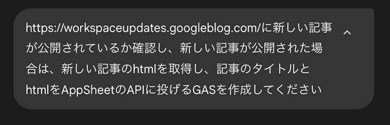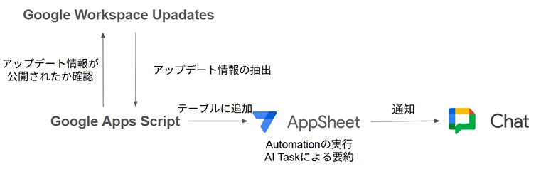 この記事では、そんな課題を解決するアプリについてご紹介します。今回は、Google Apps Script と Gemini in AppSheet Solutionsを用いて作成しました。Google Workspace のアップデート情報が公開されると、アップデートのタイトルとアップデート内容を要約した文章を Google Chat のスペースに通知します。