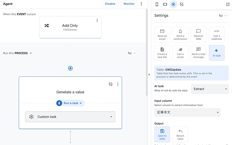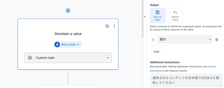 アップデート情報を要約するプロセスを作成します。今回は、AI に要約を行って欲しいため、「AI Task」の「Extract」を選択します。また、Input column の欄で入力する値を指定し、 Output の欄で出力結果を保存する場所を指定します。そして、Additional instructions の欄で、AI に指示を与えるプロンプトを記述します。プロンプトは、日本語で記述しても期待通りに動作してくれます。