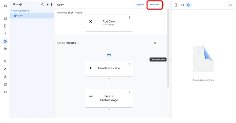 Automation を設定する画面の「Monitor」ボタンをクリックすると、Automation の実行履歴を確認することができます。