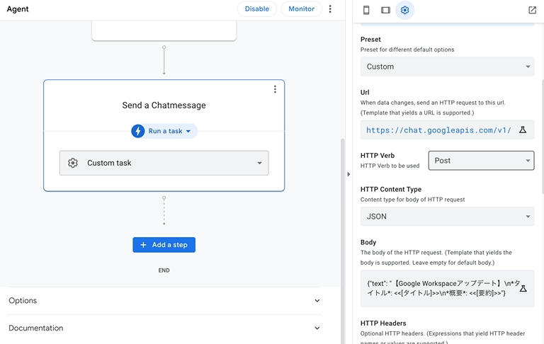 新しく公開されたアップデート情報を Google Chat のスペースへ通知するプロセスを作成します。今回は、webhook を用いて作成します。Google Chat の通知したいスペースのwebhook を追加し、その URL を指定します。また、通知したい内容を HTTP Content Type や Body の欄で作成していきます。今回は、JSON 形式でアップデート記事のタイトルと要約が通知されるようにしました。