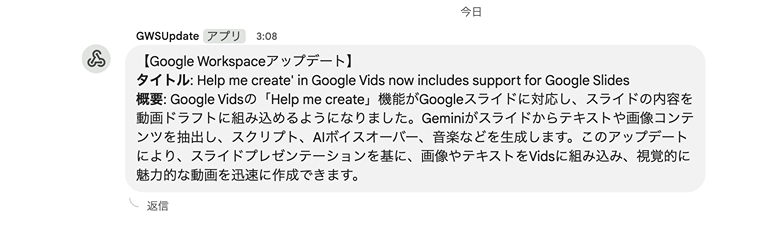 Google Chat の特定のスペースにアップデート記事のタイトルと内容を要約した文章が通知されます。